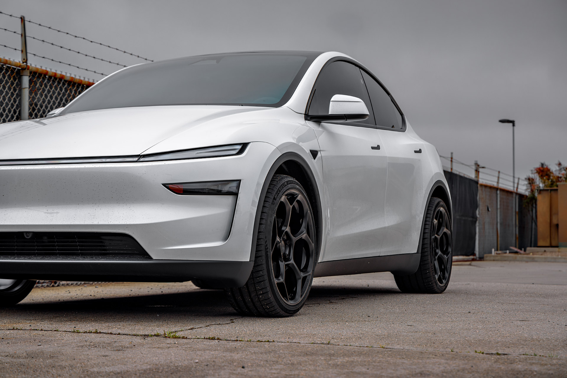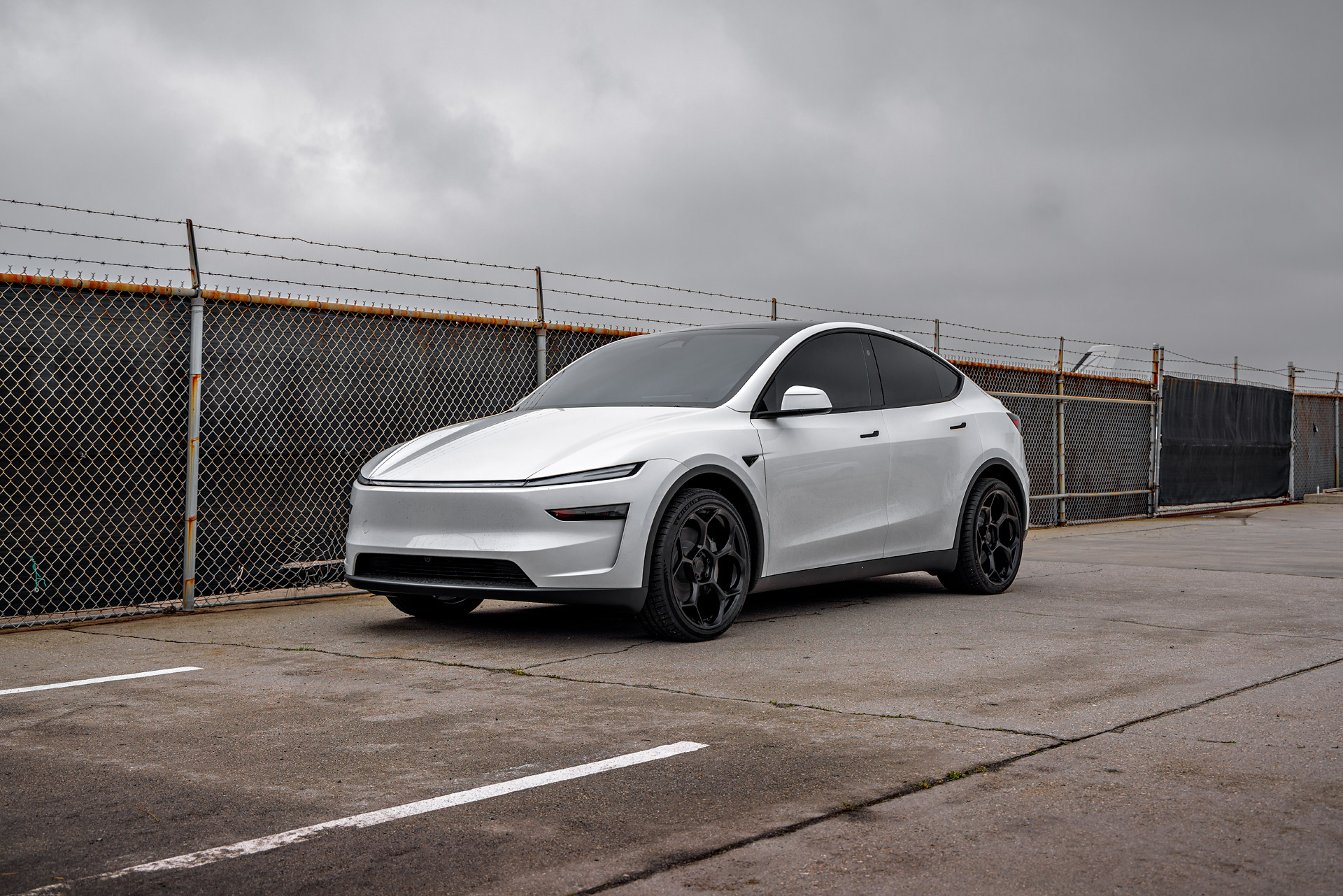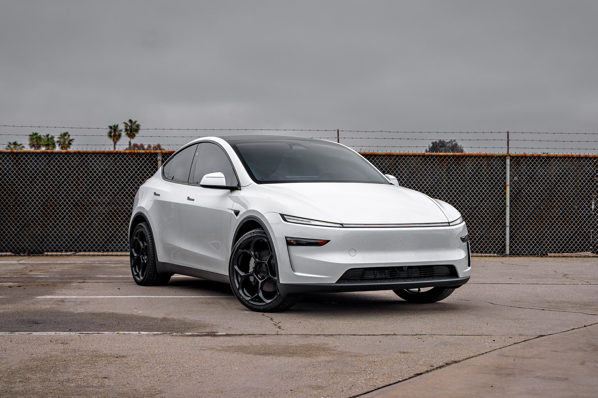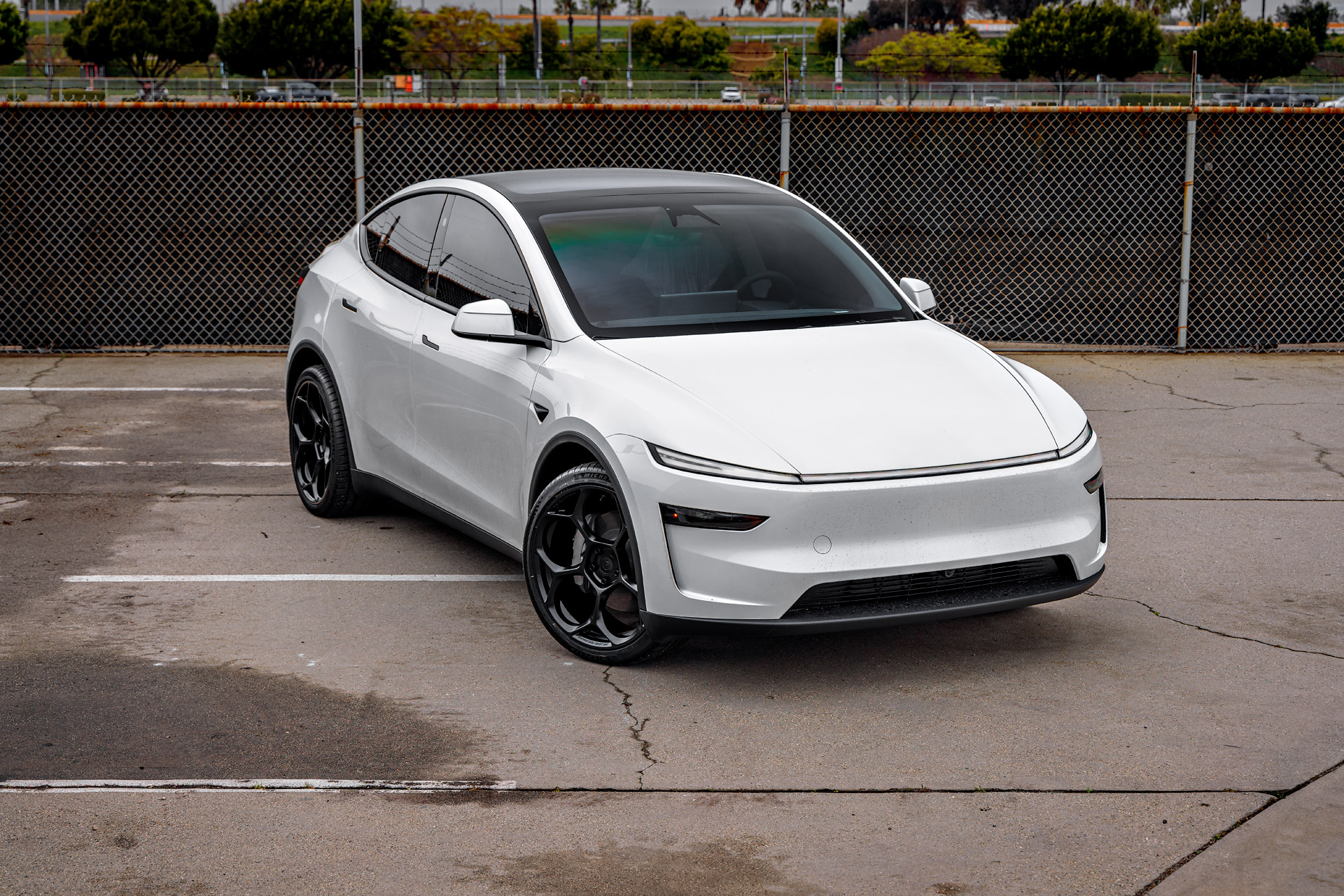 White Lowered Tesla Model Y Juniper on UP Forged UP-RW Road Warrior Wheels