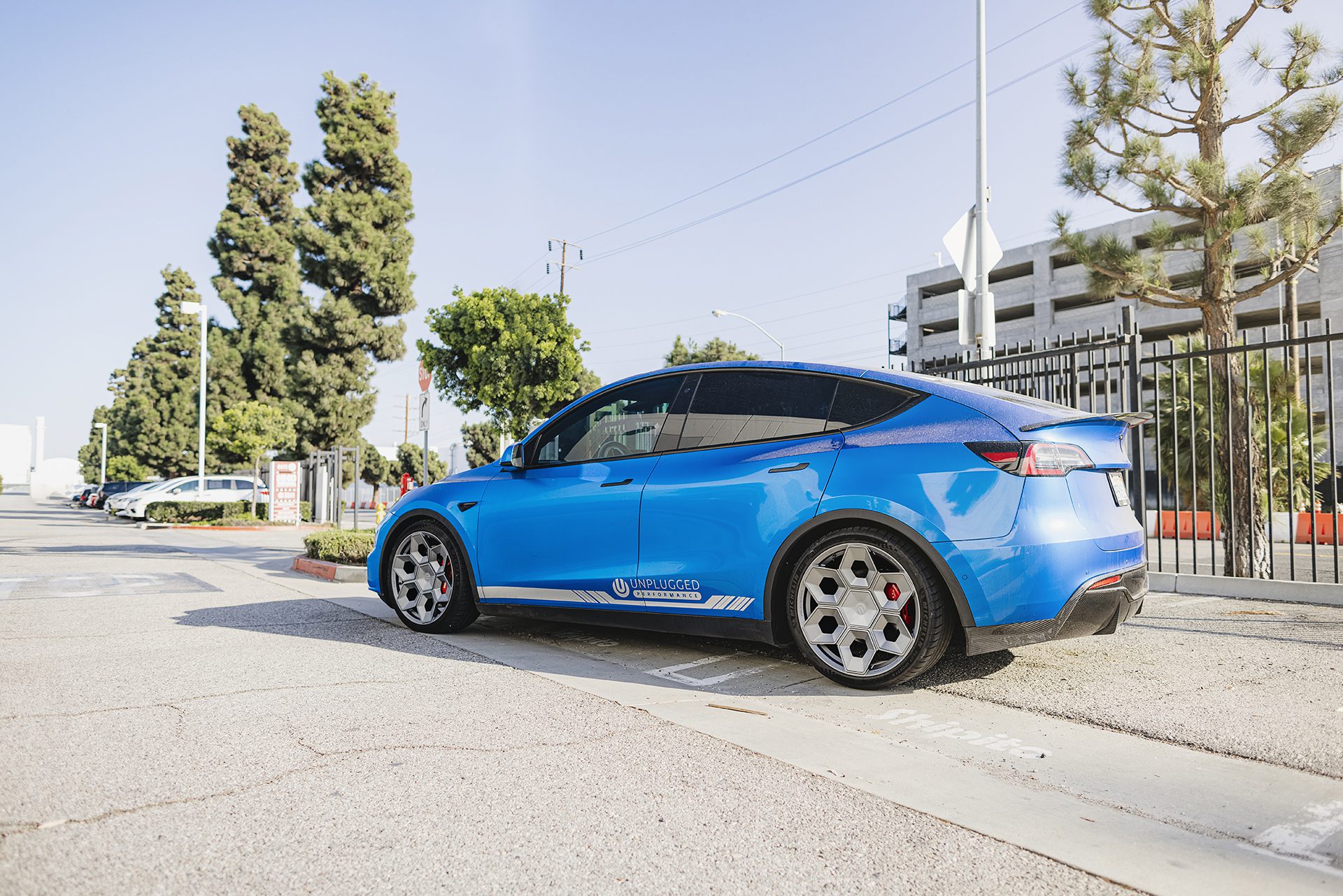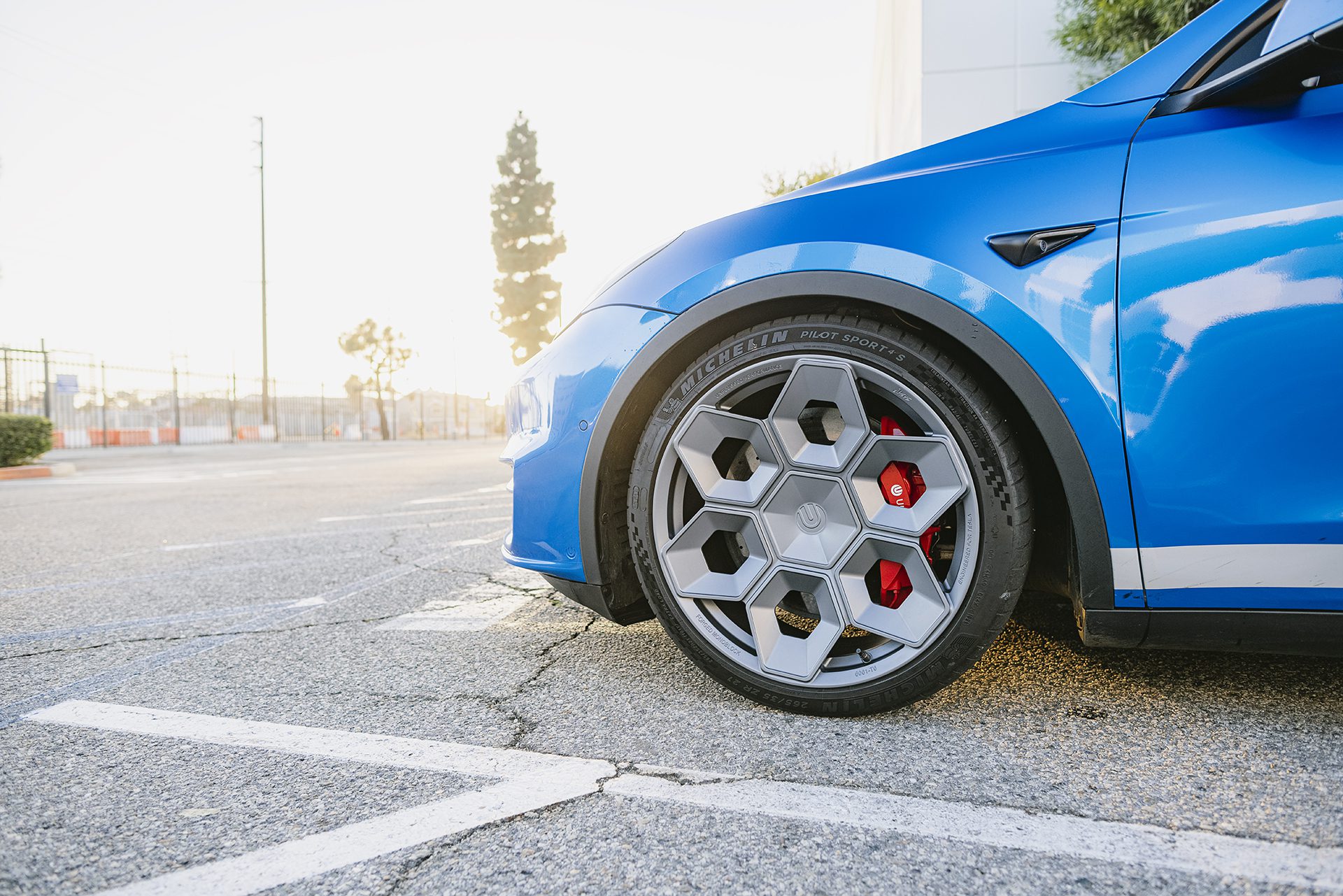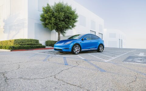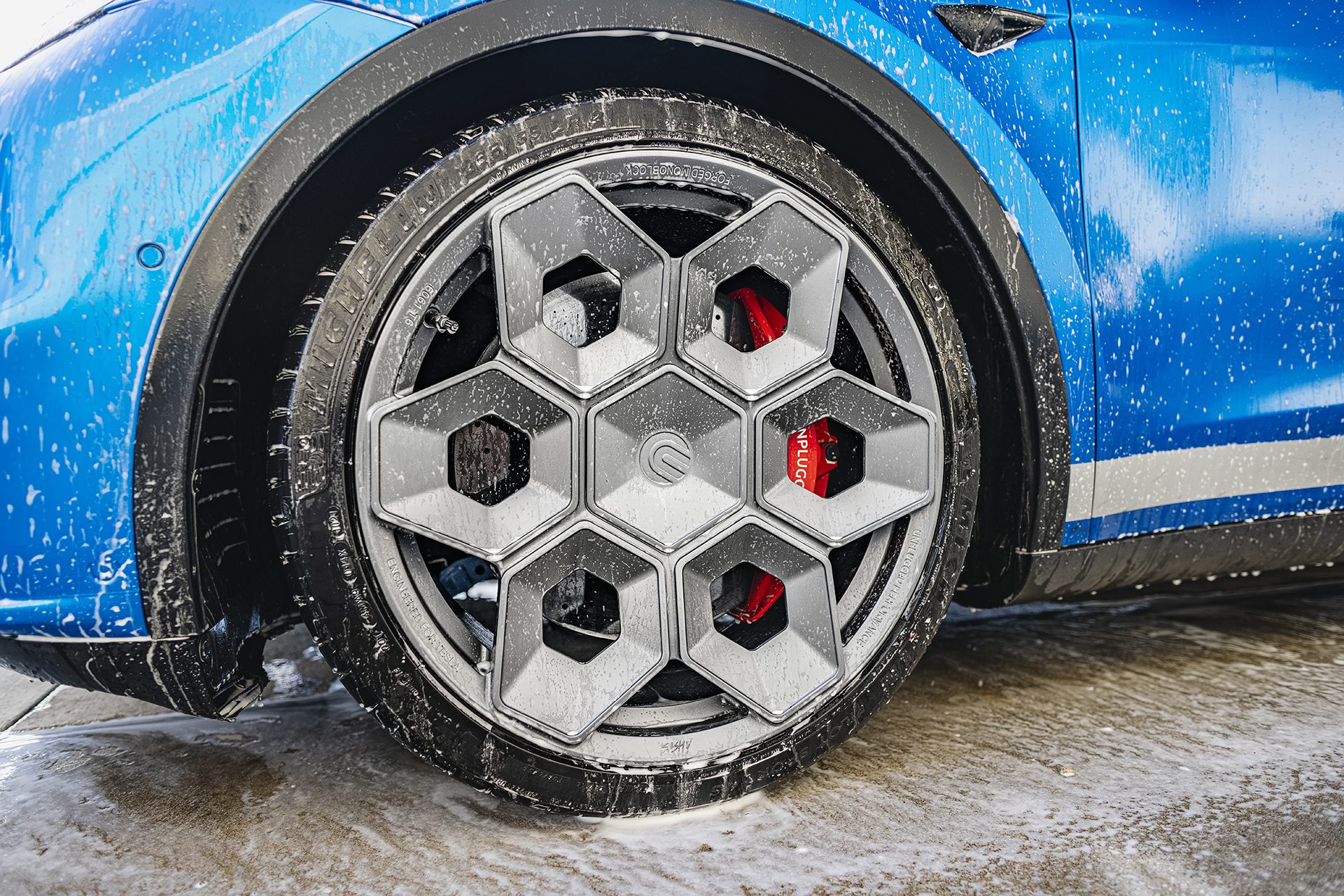 Deep Blue Metallic Tesla Model Y – UP CYBRHEX Forged Wheels in Satin Titanium