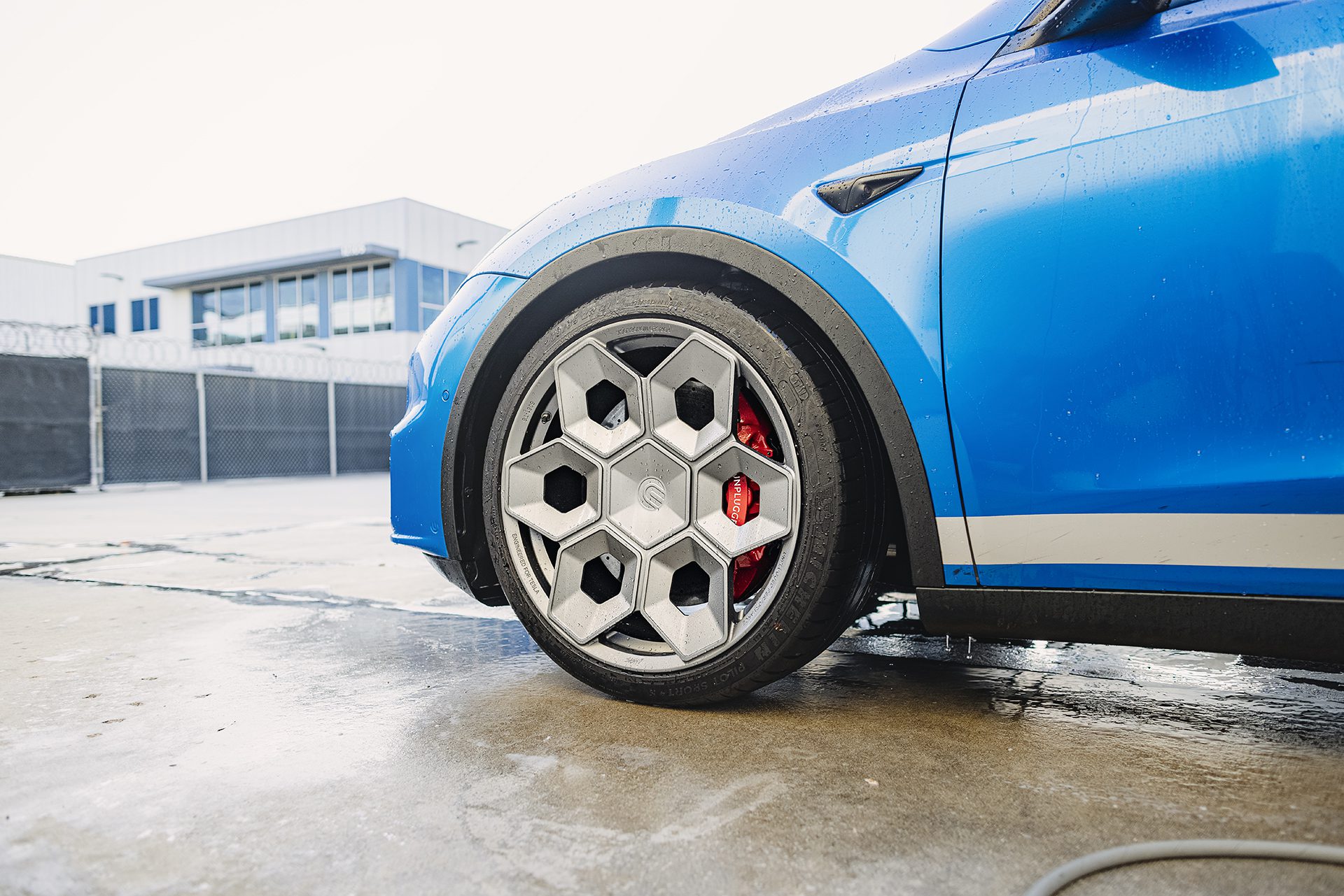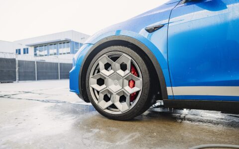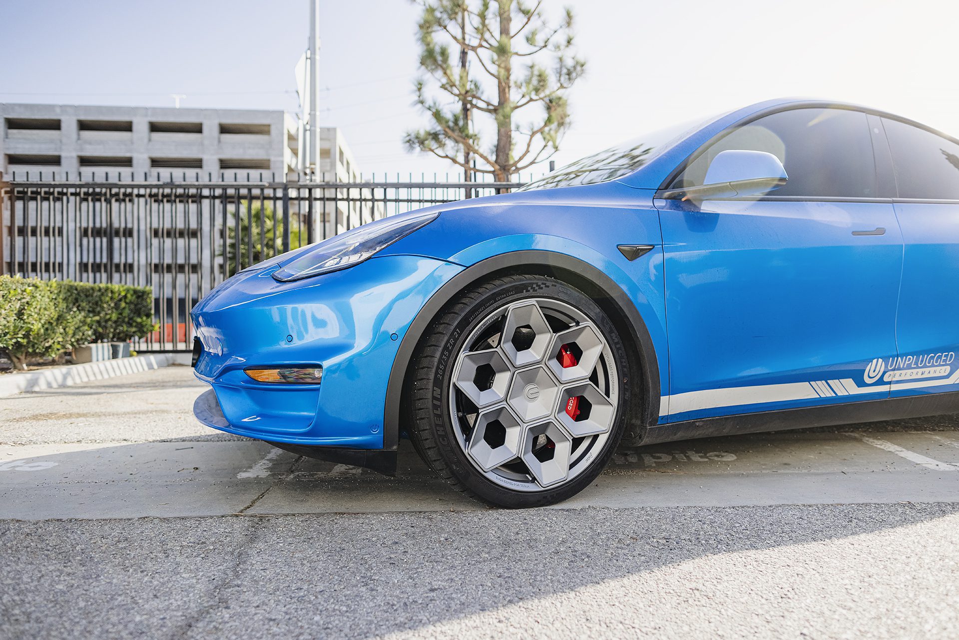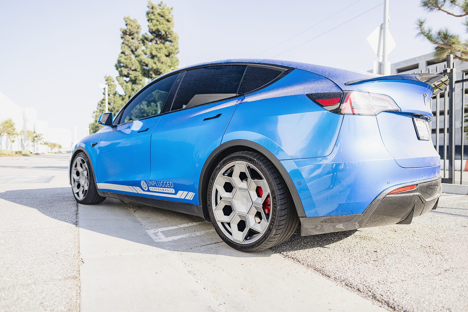 Deep Blue Metallic Tesla Model Y – UP CYBRHEX Forged Wheels in Satin Titanium