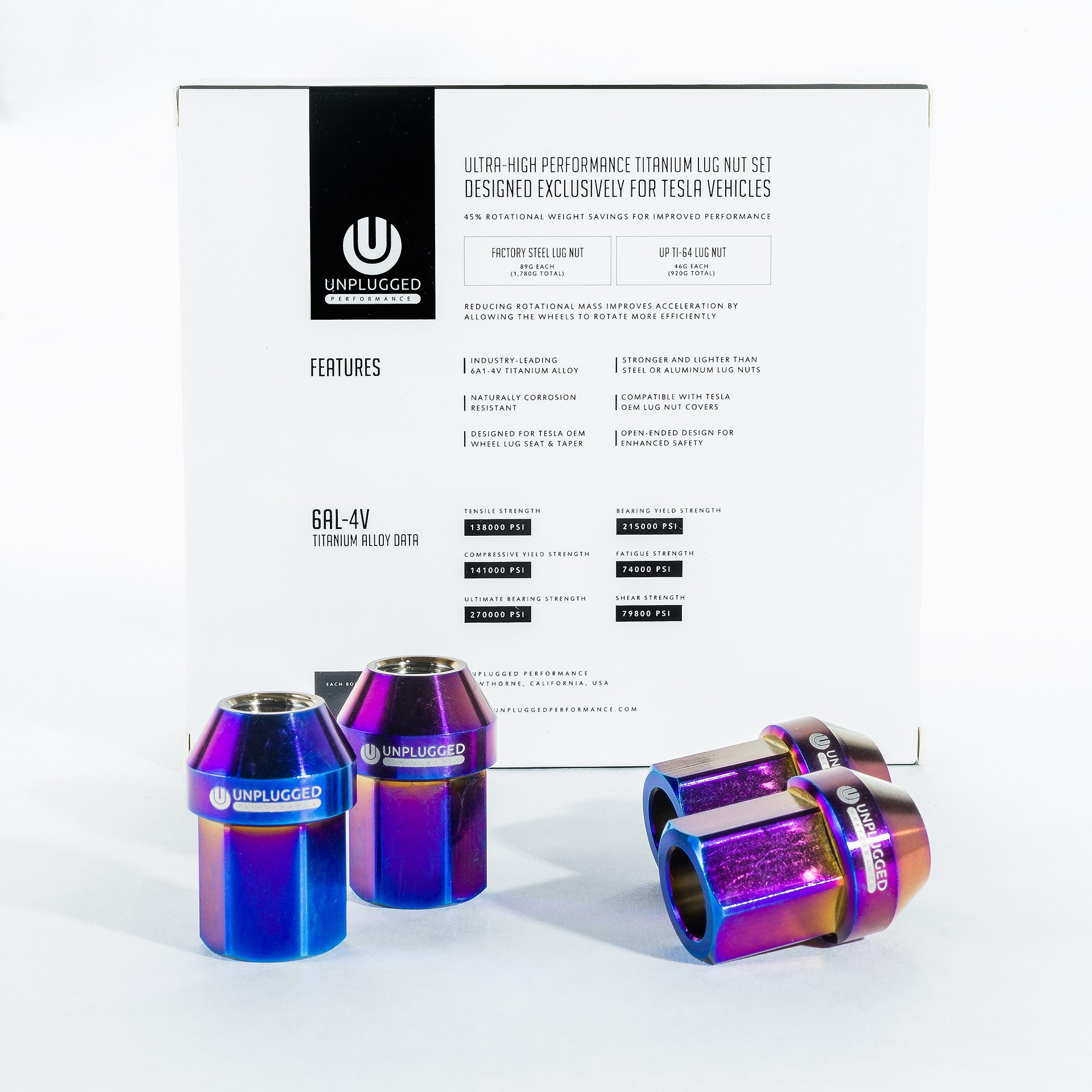 In our never-ending effort to remove weight from Tesla vehicles, and thus improve range and performance, we created our Superlight Titanium Lug Nut Set. Produced completely from 64-grade titanium for impressive durability and weight savings, the Unplugged Performance Superlight Titanium Lug Nuts save 46% of weight versus the OEM steel lug nuts.
